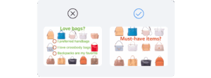 Reklama në të majtë bën një pyetje dhe i ofron shikuesit tre mundësi për të zgjedhur, në mënyrë që t’i shtyjë ata të klikojnë në reklamë. Kjo reklamë nuk do të miratohej. Në reklamën e dytë, ne kemi hequr ato butona.